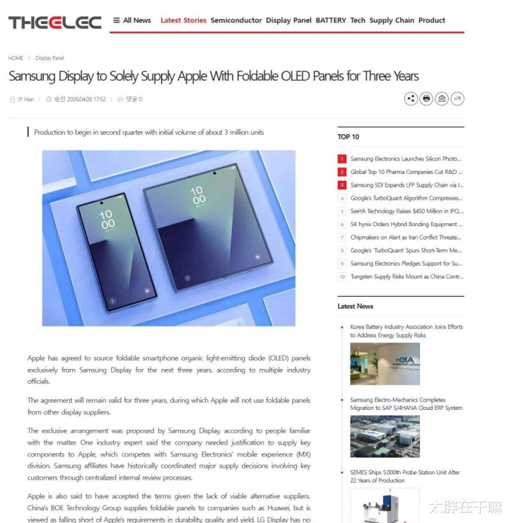 三星炫耀已于苹果签署了为期三年的折叠面板供应左券,