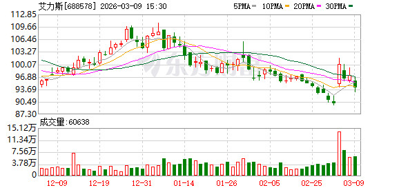 艾力斯3月9日巨额来回平台出现一笔成交,成交量10.00万股,成交金额940.30万元,巨额来回成交价为94.03元。该笔来回的买方贸易部为机构专用,卖方贸易部为摩根大通证券(中国)有限公司上海银城中路证券贸易部。